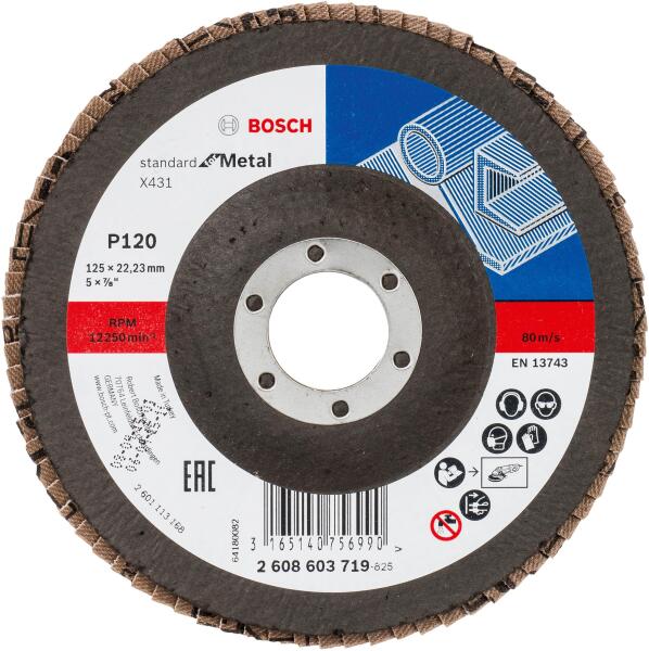 BOSCH X431 legyező csiszolótárcsa, Standard for Metal X431 Standard for Metal, egyenes, üvegszövet alátéttányér, 125x22.23mm, szemcsézet 120 (2608603719)