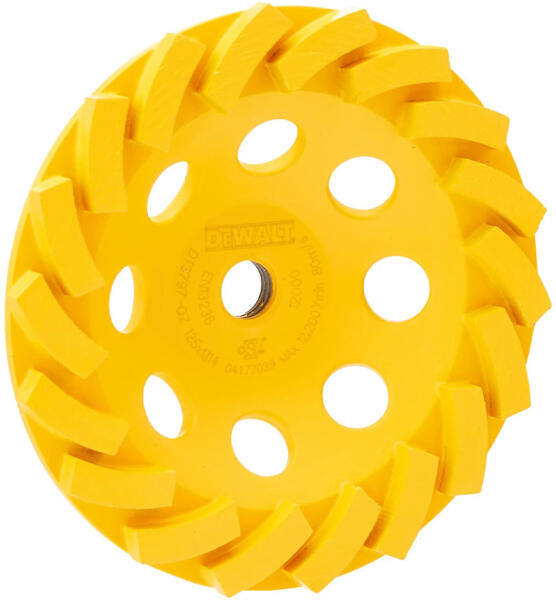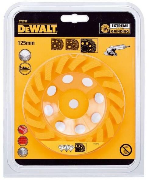 DEWALT DT3797-QZ Gyémántszemcsés fazékkorong turbo - 125 mm M14 A gyémántszemcsés fazékkorongokat úgy tervezték, hogy illeszkedjenek a 125 mm sarokcsiszolókhoz a megfelelő védőburkolattal (DWE46150 felület burkolat). Alkalmazás:
