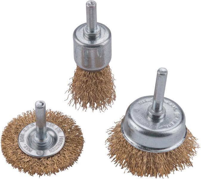Sárgaréz bevonatú kefék, 3 db-os készlet. info max. fordulatszám 4500 ford/perc. márka EXTOL CRAFT. további paraméterek átmérő 25-50-50 mm, szárátmérő 6 mm, acél-sárgaréz bevonatú bordás huzal S 0,3 mm.