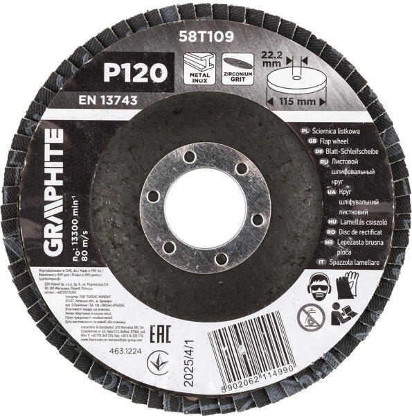 GRAPHITE Csiszolókorong lamellás 115x22, 2mm, P120 inox, fém, fa (58T109)