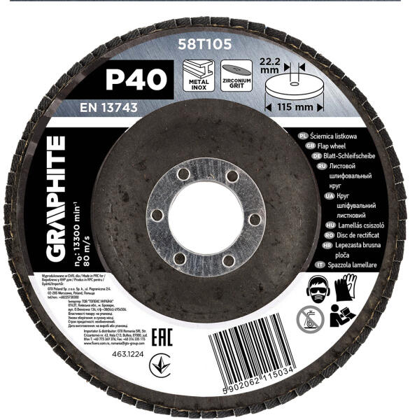 GRAPHITE Csiszolókorong lamellás 115x22, 2mm, P40 inox, fém, fa (58T105)