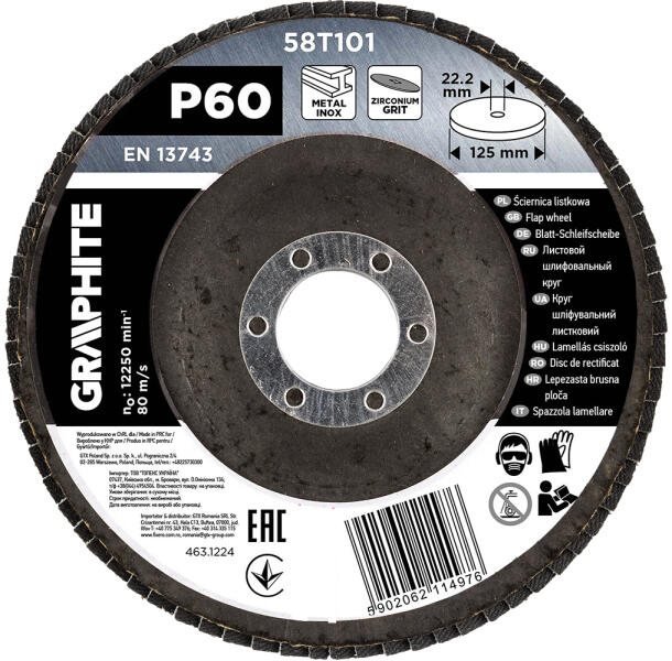 GRAPHITE Csiszolókorong lamellás 125x22, 2mm, P60 inox, fém, fa (58T101)