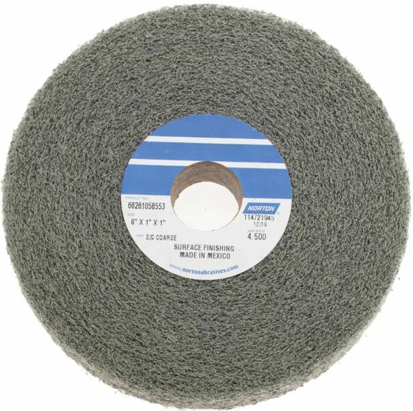 Norton Rapid Finish DSS Surface Finishing Open Mesh rost csiszolókorong szemcsékkel és gyantával impregnált szövetanyag tekercselésével és ragasztásával készült a központi mag körül. A Convolute kerekek sokféle felhasználási lehetőséget kínálnak, beleértve a sorja, a rozsda és oxidok eltávolítását, valamint a dekoratív felületkezelést ott, ahol kevés vagy egyáltalán nem kell anyagot eltávolítani. Nyitott hálószerkezet könnyű és közepes nyomású, alacsony fordulatszámú felhasználásra dekoratív befejező alkalmazásokhoz. Szilícium-karbid és Alumínium-oxid csiszolóanyag finom simításhoz enyhe nyomással. A korongot egy mag körül tekercselik, ezért mindig a kerék oldalára nyomtatott nyíl irányában kell forgatni. Termék információk: