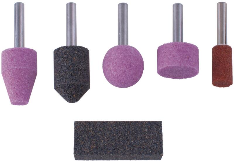 Csiszolófej - fém, műanyag, kerámia és üveg csiszolásához, egyenes és kerekített végződés, hengeres, kerek, kúpos fejforma, anyaga alumínium-oxid, 6 darabos csomag