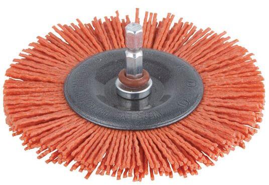 Csiszolókefe fúrógépgépbe - tárcsa, alkalmas rozsdaeltávolításhoz, polírozáshoz, tisztításhoz, alkalmas fém, fa és kő csiszolására, anyaga nejlon, hullámos drót, rögzítés módja szár, kefe átmérője 100 mm, drót hossza 10 mm